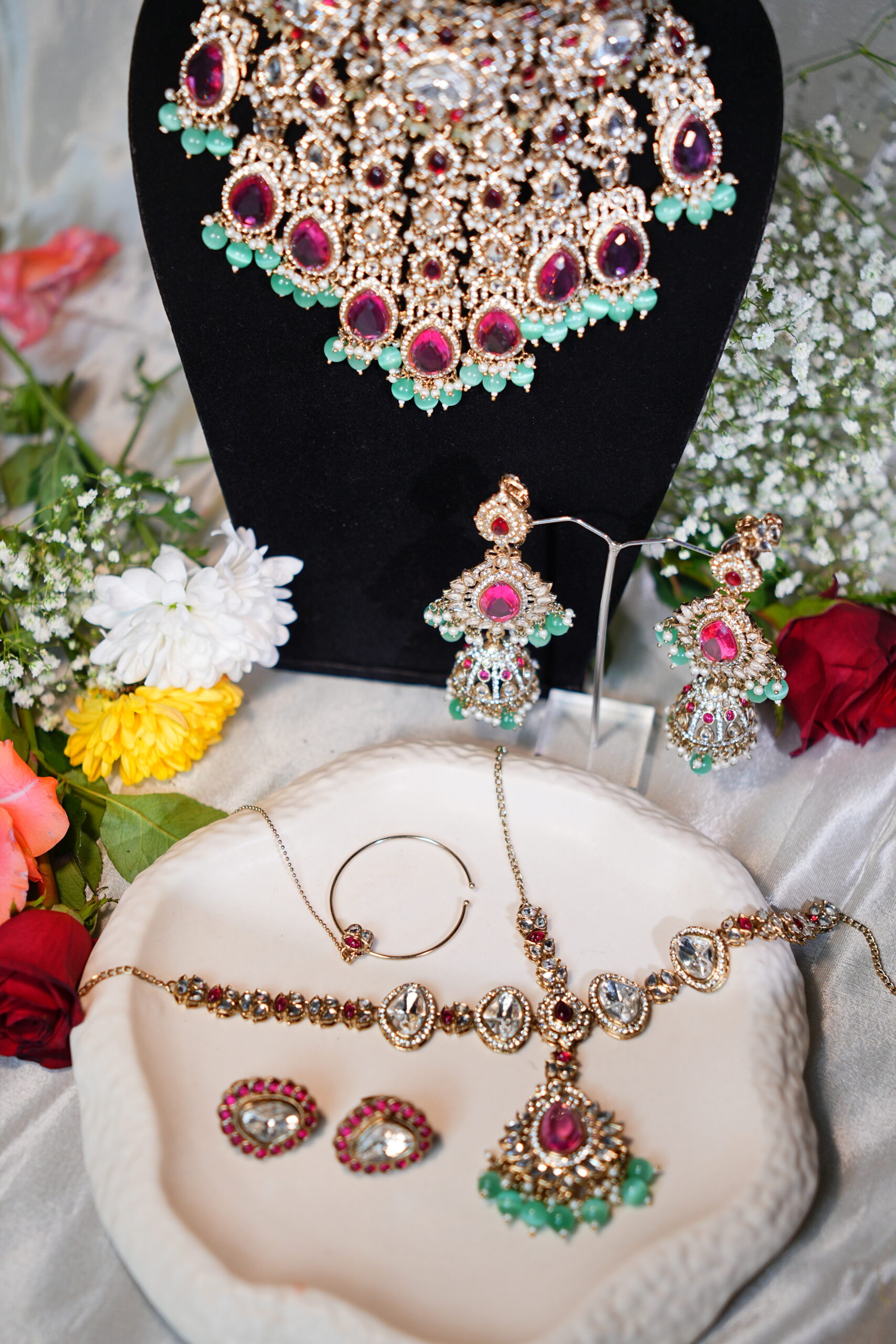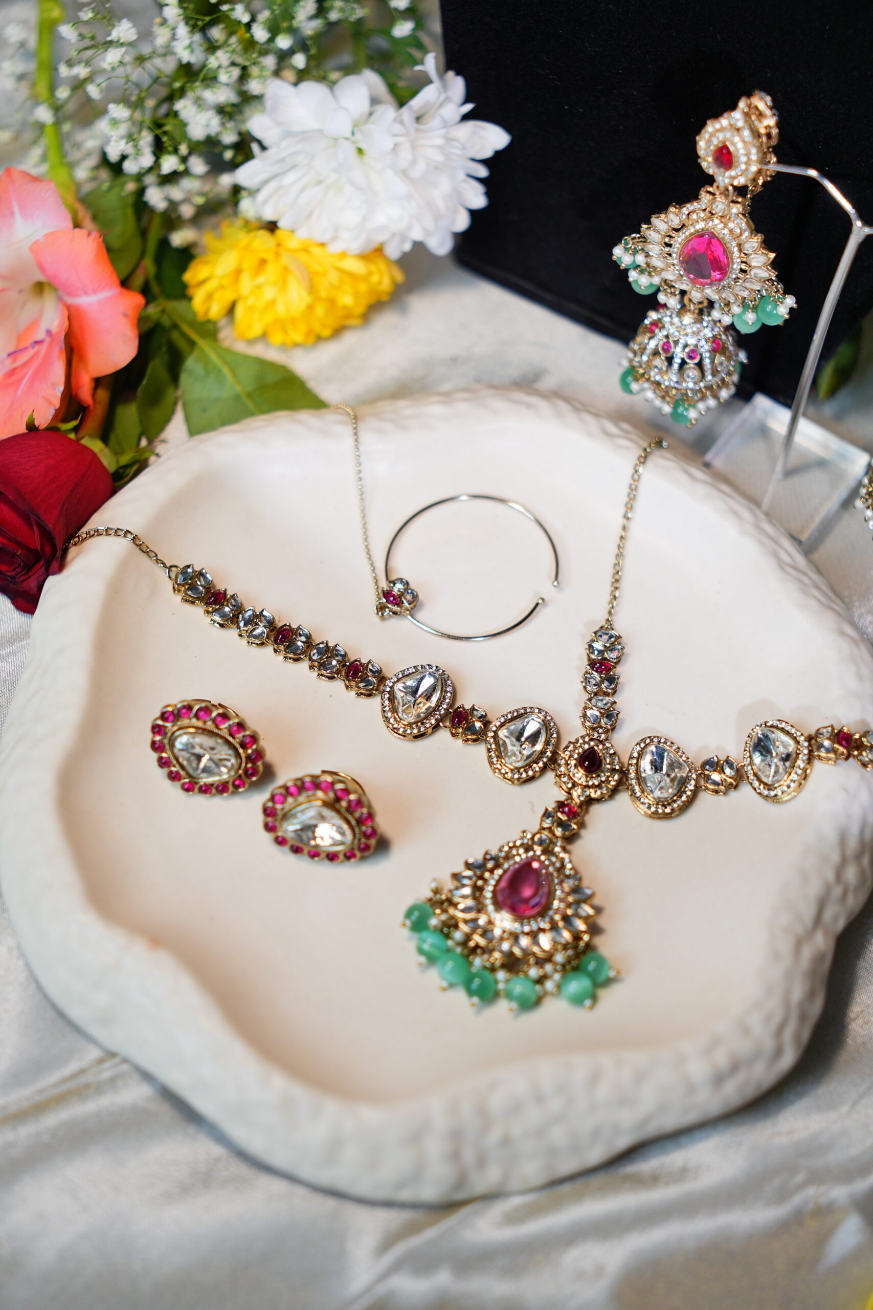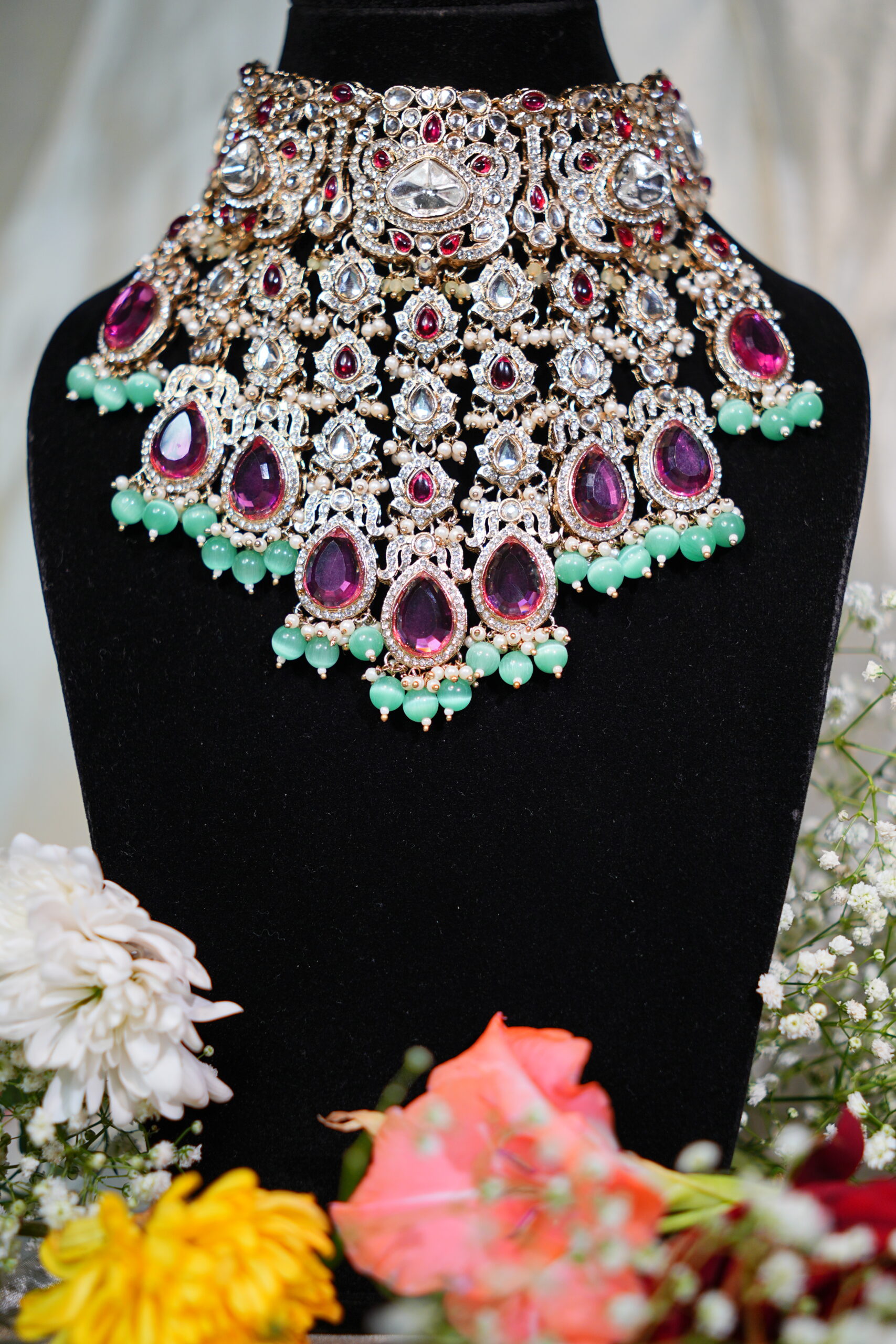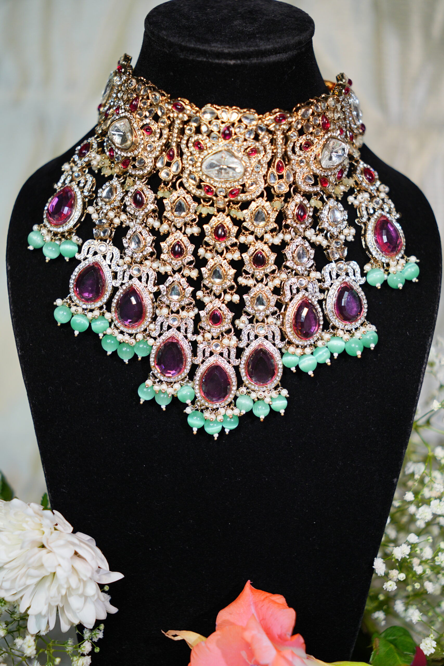 Made with moissanite, American diamonds, polki stones & silver plating